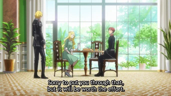 While Reinhard is getting the thing, Annarose tells Siegfried that she appreciates him following her brother faithfully all this time. He tells her that really he's the one just benefitting from his relationship with tactical prodigy Reinhard, but she cuts through that before he can even finish the sentence.
