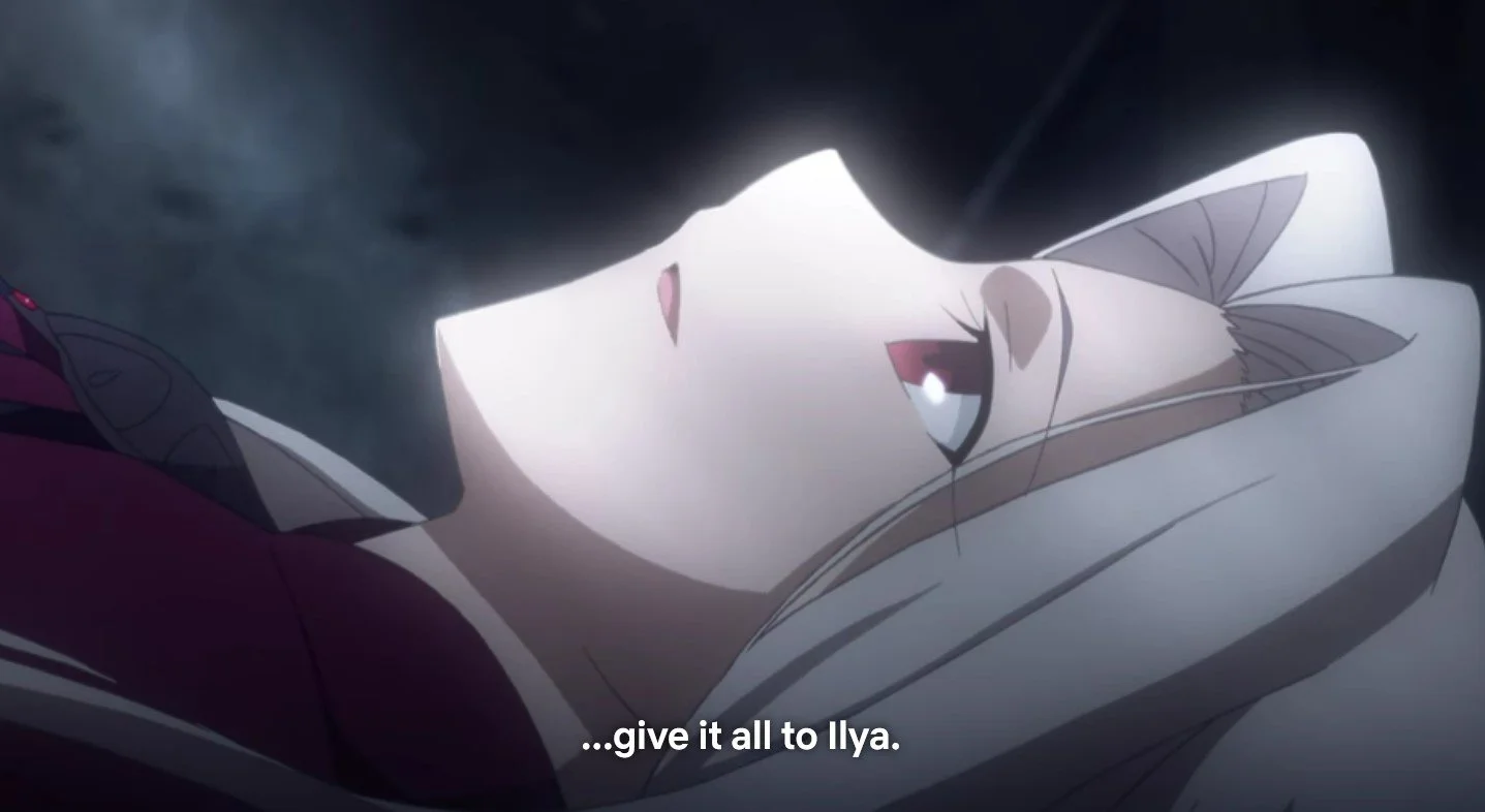 Maiya asks Iri why she's so dedicated to Kiritsugu, and Iri explains that it's because she was raised in an isolated castle and kept away from the rest of the world, so Kiritsugu and eventually Ilya are literally the only things she was ever given to care about. Maiya asks how she can care so much about his ideals when she hasn't even seen the world he wants to change, and she admits that she doesn't understand any of the words he says; she just agrees with them, because he said them.