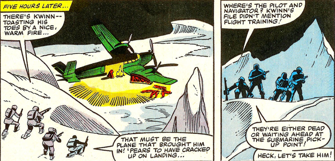 Also, frankly, even if he isn't hurrying (for some reason) and they are, you're not going to outrun a dogsled on foot in these conditions. It just ain't happening. It feels like this would be a great moment for the GI Joes to break out another new gadget of their own; some kind of collapsable motor-sled with high speed but very limited fuel that they were given in case they need to beat a fast retreat or something. That's how they USUALLY deal with grim developments like this, isn't it?