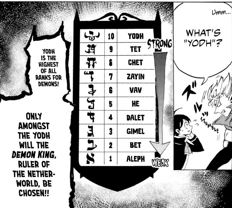 Apparently, rankings for students at this place are spread across the first ten letters of the Hebrew alphabet. Your initial rank depends on your familiar summoning outcome, along with a few other factors, and then rises and falls throughout your time at Babyls depending on your academic performance and fearsomeness and stuff. It is only from among the ranks of those who graduate in the Yud ranking that the demon kings are chosen (it's apparently not a hereditary position, despite the name), and Sabnok is determined to be an eligible candidate.