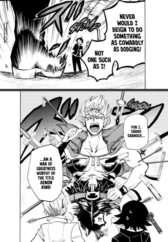 Anyway. Sabnock dickwaving about how he's just appointed himself all of their rivals and is also sure he's going to crush them all and become the demon king (because apparently that's in the cards) turns into an opportunity for exposition that...frankly, it would have been more natural to have Azz explaining this earlier instead of droning on about the meal plan system. It's not like the latter ended up being relevant to that chapter's (attempted) jokes in the end. But whatever, here it is now.