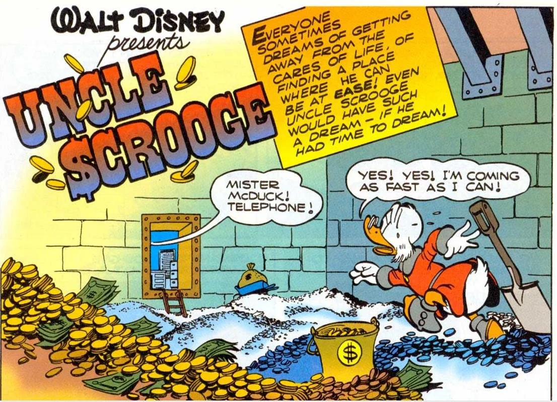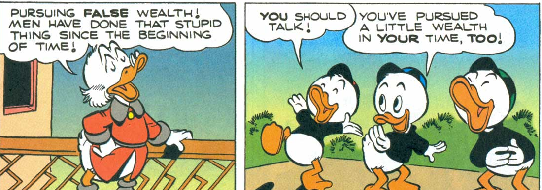Also before getting into it, I want to make it clear that I do understand that the comic is not approving of Scrooge's behavior. Obviously, the joke about Scrooge thinking he needs to fly away to the Himalayas to get away from his wealth (while meanwhile anyone raising the subject of him just giving it away is met with literal nervous breakdowns) is intended by the author. That's Scrooge being dumb and greedy, and you're supposed to laugh at him for it. I'm not criticizing its assessment of the individual characters here, but rather it's background assumptions about society.