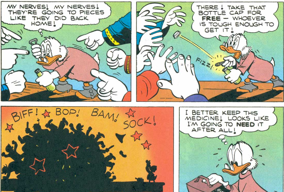 So, on its surface, what comes next is a pretty elementary satire of how greed corrupts and reshapes every society it comes in contact with. Scrooge throws away one of the bottlecaps for his medicine (it comes in basically beer bottles, apparently. lol) and one of the natives picks it up. And then all the other natives want it from him, since it's the only bottlecap in the entirety of Tralla-la. It gets traded and accumulates value. And then they find out that Scrooge still has several bottles of his medicine with him, and that each of those bottles has another cap on it, and suddenly he's the rich man being beseeched and wheedled and threatened by the rest of the community again.