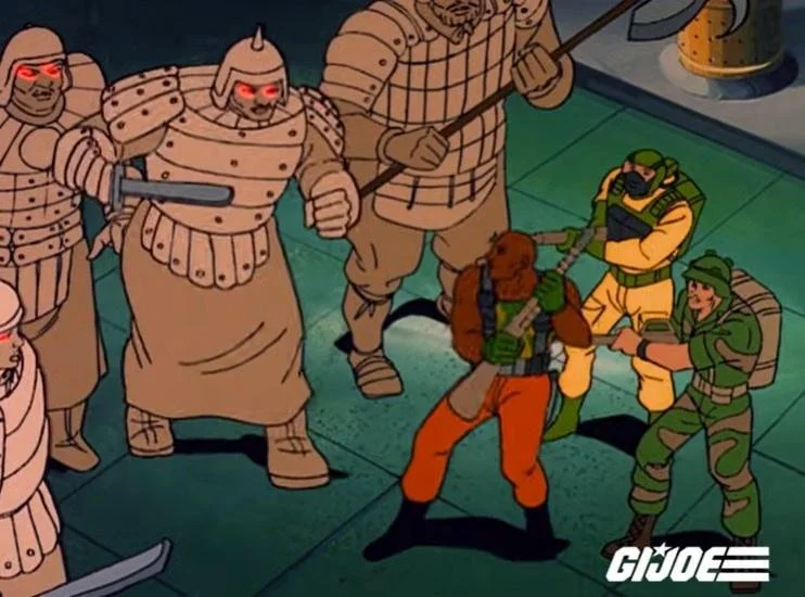 Meanwhile, the belated confrontation in the City of the Dead turns out to be...in a different City of the Dead than the IRL famous one. We're in China rather than Egypt. Cobra plants a cube inside of this ancient mausoleum and trust the ancient defences to take care of Roadblock's pursuing Joe team. You see, the Cobra officers know that if you step on the wrong floor tile in the mausoleum's entrance hall, it will activate a pressure plate. And if that pressure plate gets pushed, hundreds of terra cotta warriors will suddenly come to life and kill any intruders in the entry hall. The GI Joes did not know about this historical curiousity, and end up suffering for it.