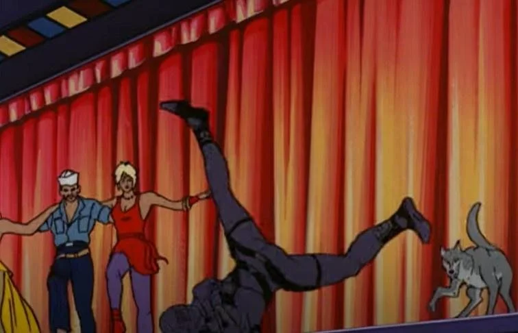 So, Snake-Eyes, Shipwreck, and the pets? They've managed to plant the tracking chips and steal some vital data before escaping the Cobra base and reaching the surface again. Only, this puts them in a city. A Cobra city. Or...actually, I'm pretty sure it's the same city that the Joes were defending back in the first episode, but like. A Cobra neighbourhood. Maybe it's like East and West Berlin or something, but there are Cobra propaganda posters up all over the place, and Cobra military police patrolling the streets that the Joes need to avoid. They end up running into a diner/nightclub to hide for a bit and get some food, and then suddenly this is a world war 2 movie about a pair of American agents trying to lay low in Vicchy France.