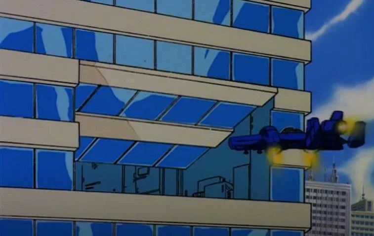 When it seems like Cobra Commander and his minions have made an undignified retreat underwater after failing to grab the space shuttle, it turns out he was just leading the pursuing Joes in their amphibious fighter-submarine-planes into a trap. He has these huge underwater robots waiting for them that are specifically designed to suck submarine-planes into their mouths and spit them out again with sufficient force to break them open, and they do just that. Meanwhile, his own air-combat specialist Destro leads the Joes' own air units in a long, fruitless chase before suddenly flying between two skyscrapers out of their sight and doing this: