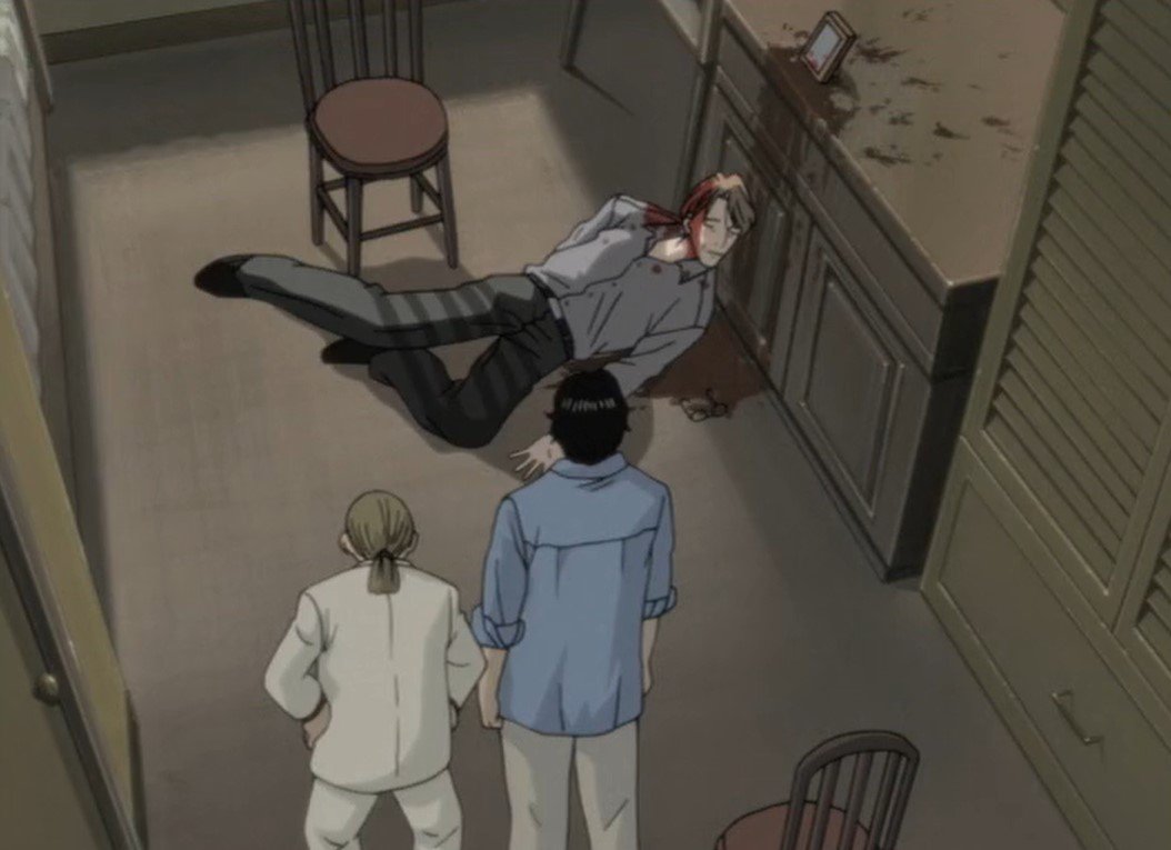 In exchange for the criminal doctoring (well, sort of. Kenzo needed a gun pointed at him before he'd go along with his side of the deal), Giovanni Skaven tells Dr. Tenma about the man he saw breaking into the mansion at the time of the double-homicide. The description sounds nothing like Johan, but it doesn't have to, the kid has no shortage of criminal lackeys to do his dirty work. Giovanni even tracked the killer to his home on that night, hoping to blackmail him, but was disappointed to find only a working class man in a cheap apartment and decided it wasn't worth it. Rather foolishly, Kenzo goes to the man's apartment, and - finding the door unlocked - comes inside to find the killer waiting for him.