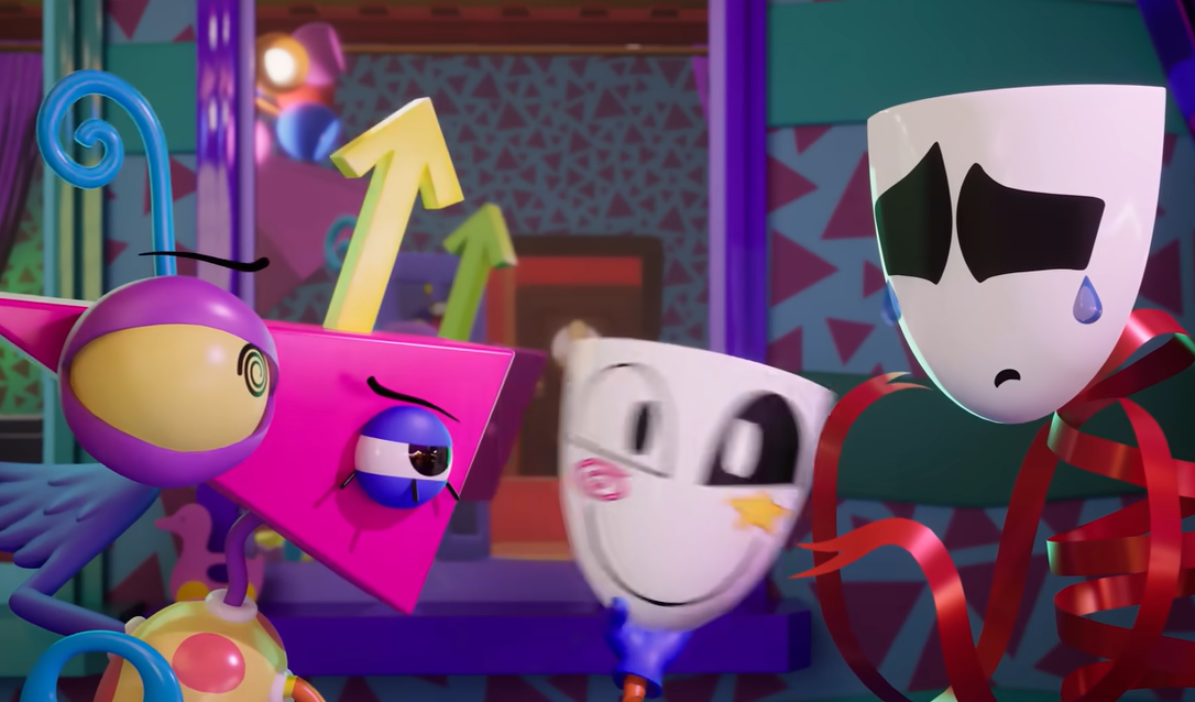 The episode starts out with Gangle, the balloon-string-drama-mask person whose role in previous episodes consisted of being sad about missing her comedy mask, being given a new comedy mask by Zooble. Turns out that Zooble found one in the box of spare body parts that Caine gave them, and they figured having it might cheer Gangle up again.