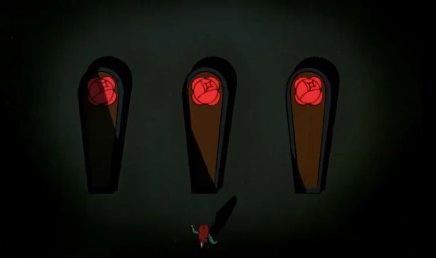 They reach the arena, where...it's broad daylight. I guess it's just always bright and sunny here, regardless of what time of day it is anyplace else. At the side of the arena, where the Rose Bride normally stands to await the victor, there's a gigantic rose blossom, and inside of the blossom there's a coffin identical to the ones Utena's parents were buried in.