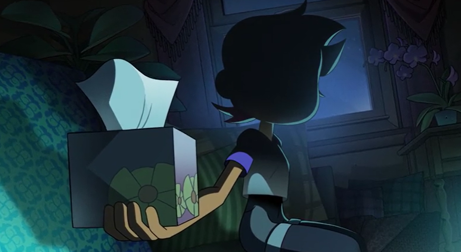 The episode ends with Lilith deciding to catch up for lost time with Gwendolyn, and moving out of the Owl House. Good, fuck off Lilith, I don't want you back on my goddamned screen unless you're on fire. Before leaving, Gwendolyn tells Luz some ancient rumors about another human who crossed back and forth between here and Earth, and where she might want to look to research more about this. Additionally, there are natural crossings between the two worlds that take place near large titanblood deposits. As far as anyone knows, these natural portals are short-lived and only let small objects through; however, it's possible that there's a connection between these two phenomena. Hopefully, folowing these leads will let her discover a way home. Luz hopes she can find it soon, because she knows her camp is supposed to have ended by now, and she's wracked with guilt and worry about what her own mother must be going through right now. Seeing what Eda's misfortune did to her mother has gotten Luz rightly fearful.
