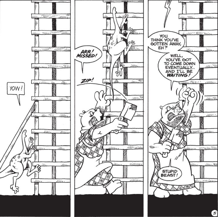 So, "The Tower," aka "In Which Usagi Gets a Pet Saurofrog." This one uses a very strange and surreal permutation of the "cat in a tree" cliche. Our story starts with a saurofrog nosing around in a village marketplace, as they're wont to do, and managing to steal some meat from a restaurant. The owner, well. Between this and the fact that we have another Blind Swordspig episode coming up, I'm starting to wonder if "porcine" is just Sakai's visual coding for "has serious anger management difficulties."