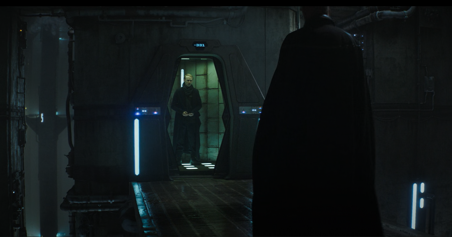 The cinematography does some interesting things here. Framing the elevator shaft that Lonni is standing in like a prison cell, with Luthen standing before the doors and barring his escape like a guard. A piece of imagery that's much easier to identify after multiple episodes of watching Cassa in a literal prison.