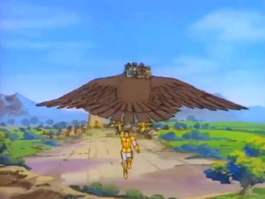 Back in the woods, the knights flee the warlords, but then get caught by Lord Viper and some others. They fight until they start getting overwhelmed, and then one of them uses his shield-summons to conjure a giant bird to fly them away. Right passed the tower that they needed to build a glider to escape from two minutes ago.