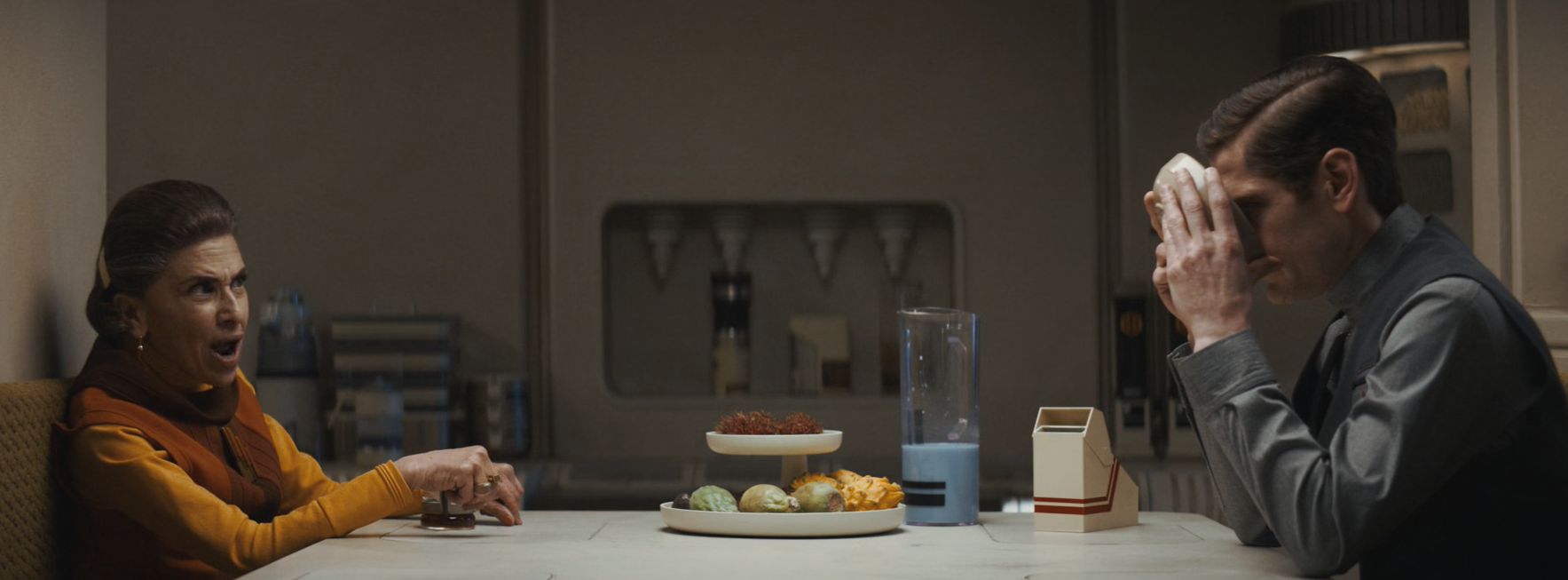 Elsewhere on Coruscant, Mothma (or...Mon? Is "Mon Mothma" her first name, or her full name? I've never actually been sure of this lol) and Val bid each other goodbye, with Mothma advising her to spend some time on the homeworld being a spoiled idle rich girl and doing embarrassingly - but apolitically - gay things for a while. Just as she herself, in turn, will just be an annoying, ineffectual liberal politician who can safely be clowned on in the senate to appeal to the rightwing base for the next little while. If Luthen is wise, he won't ask anything else of them until he's spent some time stirring up trouble elsewhere. They take a moment to comfort each other before Val leaves, and Mothma is left alone in her gilded prison of a home and family.