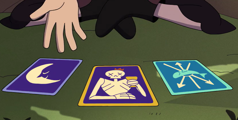 Vee's magic-sniffing nose reveals that the cards' magic has already worn out, but Luz's experience with these cards tells her that another deck that hasn't recieved as much use might still have some power in them. I'm guessing these cards do some kind of magic special effect when you play with them? I feel like I saw Luz and her friends playing with them in an earlier episode, but I can't recall any details, so I'll just take this episode's word for it.